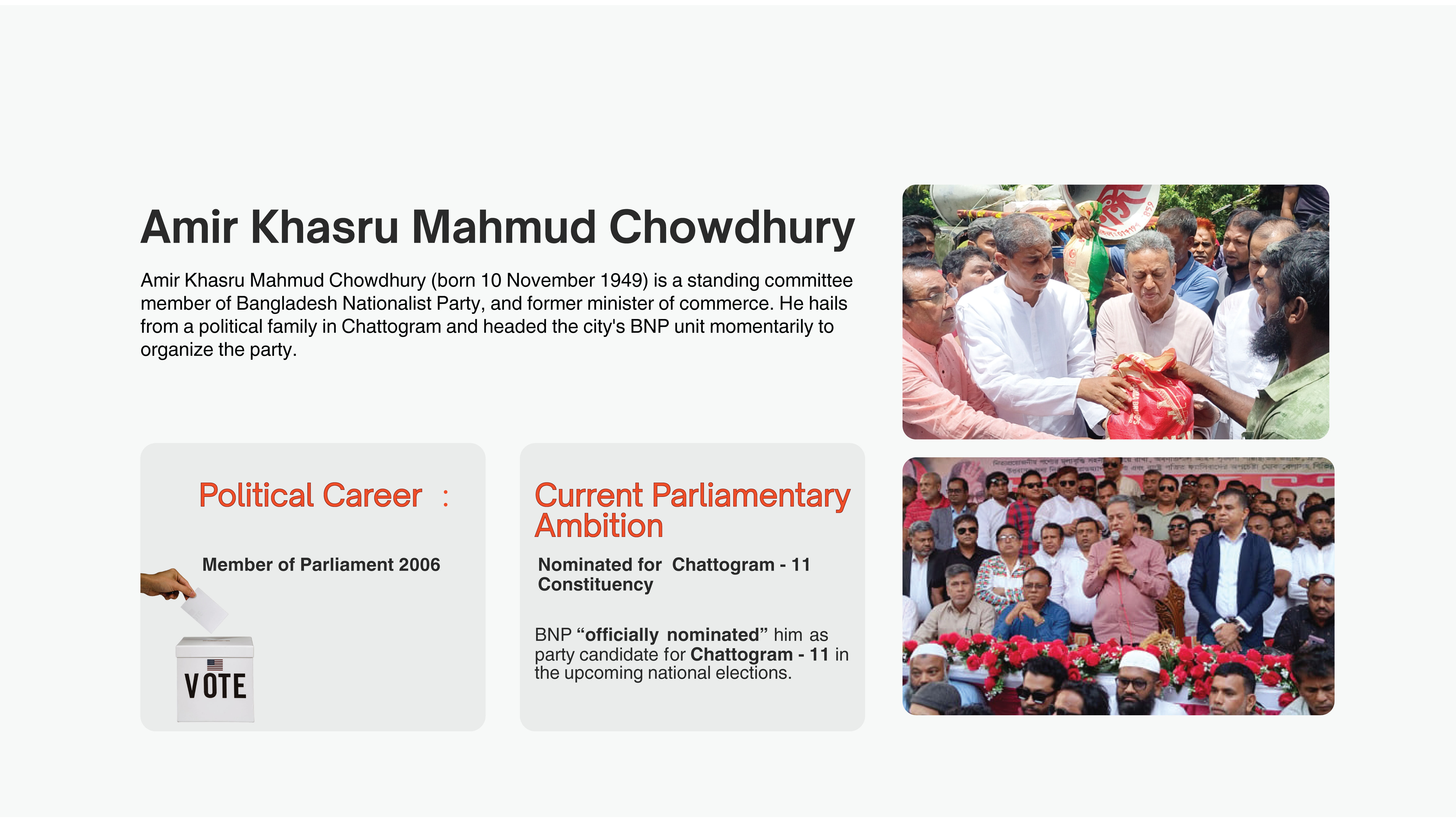 জনাব আমির খসরু মাহমুদ চৌধুরী ২০২৬ সালের সংসদ নির্বাচনে চট্টগ্রাম-১১ আসনে এমপি পদপ্রার্থী। তিনি চান তার ইশতেহার হোক জনসাধারণের আকাঙ্ক্ষার প্রতিফলন। তিনি বিশ্বাস করেন যে ইশতেহার কেবল প্রার্থী বা দল এর নয়, বরং জনগণের আকাঙ্ক্ষা পূরণের পরিকল্পনা। তাই আপনার মতামত শেয়ার করুন এবং তাকে সত্যিকার অর্থে জনগণের দ্বারা পরিচালিত এবং জনকল্যাণমূলক একটি ইশতেহার তৈরি করতে সহায়তা করুন।